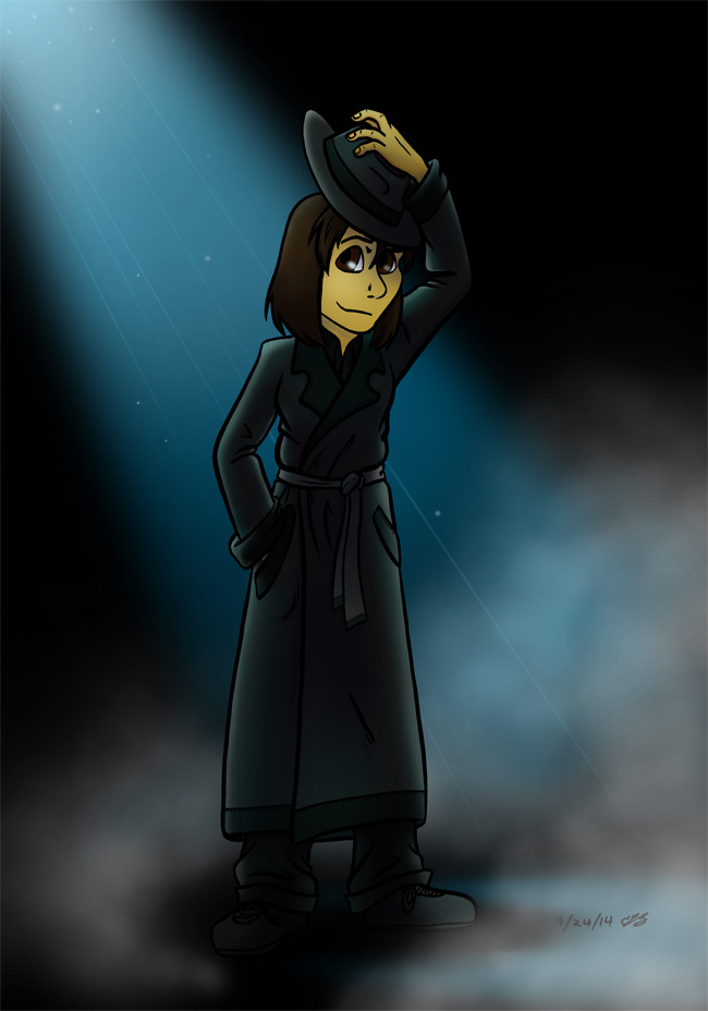 Originally this picture was going to consist of me in detective gear on a white background, but one thing led to another and after the shading started we ended up with a light beam and fog. I really don't have a good explanation for how this happened. The outfit is intentionally black, though; whenever I go to court, do an interview or stuff like that I dress in all black. This is due in part to the fact I like the black power look, and due in part to the fact it saves me the hassle of having to coordinate colors. Just because I can color silly pictures doesn't mean I can figure out what colors to put on my body every day.