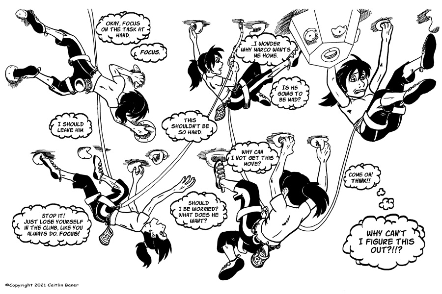 I realize the last few, and the next several, pages involve knowing a thing or two about rock climbing. For those who aren't familiar with the sport, climbing upside down (arch climbing) like Javiera is right now is considered one of the hardest ways to climb. It takes a lot of strength and skill to do it, and you don't see it often in a climbing gym. Unfortunately arch climbing wasn't featured in the Olympics, but that's okay! It's an official Olympic sport, hopefully we'll see it later! ^_^