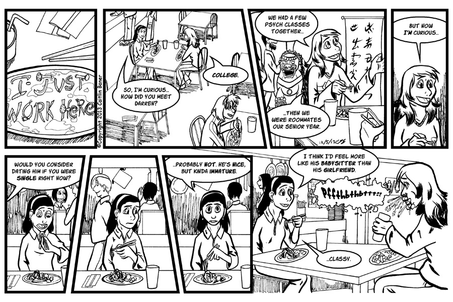 Urgh the art on this page gave me untold amounts of grief. Turns out recovering from the flu would have ideally been a two-week process, but I was so disappointed at missing last week's update I was hellbent on getting the comic up this week. I had to do quite a bit of Photoshop editing on this one, so instead of the standout comic I'd been gunning for (it's so fun to get to draw non-office scenes for IJWH) the art ended up being more average than I intended.
