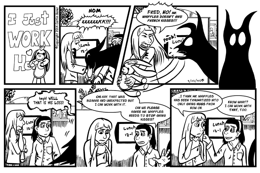 It's hard to say which is worse: The fact Fred felt compelled to put the rabbit in his mouth, or the fact Lizzie interpreted this as a "French kiss." An all-around weird morning at the office.