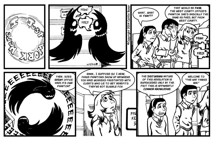Allison is exactly right: Wherever you have workers frustrated with clients who lie to get benefits they're not eligible for, you get a fraud phantom (well, in the IJWH universe, anyways, I have yet to find one in the real world. Real life is just no fun.). Ostensibly any office can have a phantom so long as the workers' frustrations are potent enough. The phantoms' personalities depend largely on the workforce they represent and are subject to change based on the overall attitude of their workforce.