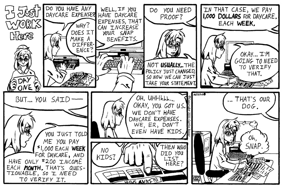 Here it is! The first-ever "I Just Work Here" comic! The truth is I never expected anything to come of it. I've always drawn comics, and when a coworker suggested I do a comic about the office, I did it with very low expectations. I gave it to our site manager asking if she would consider putting it in a monthly SNAP (previously known as Food Stamps) training letter we send out, since this was about policy. She told me she couldn't put it in the letter, since the letters are training related, but instead e-mailed a copy out to the entire office. I never in my wildest dreams expected the reaction I got.