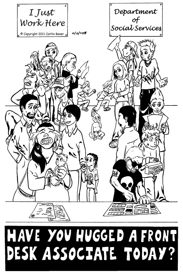 This was the first time the clients, not the workers, were the focus of the strip. The idea was to show the diversity the front desk workers routinely see, and how this can lead to a challenging day. The point of the strip is NOT to say that all clients are obnoxious and make workers' lives hard, simply that as a front desk worker, every day is an adventure. I did my best to show everything, from happiness to anger to everything inbetween. If you're a social worker, no matter what field, you will never see the same thing twice.