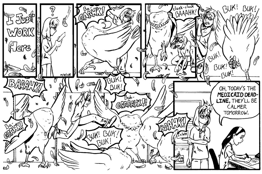 All it took for me to come up with this comic was a comment from a coworker: "I mean, we're always busy around here, but I hate the Medicaid deadline! Everyone runs around like a chicken with their head cut off!" The picture you see above is actually how I visualized that statement at that moment.