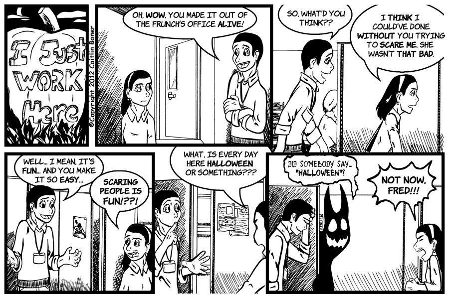 I learned a hard lesson about ink with this comic. I use Indiaman Deep Black Speedball ink because of how deep the black is... but it turns out you're supposed to mix this stuff up before using it. I haven't been doing this because the ink has been such a deep black I didn't think I needed to. Turns out the pigment stuff can settle to the bottom of the jar, and after a while there isn't enough water to keep it from coagulating. When I inked this, in the 5th panel Darren got really messed up because the ink was clumping and leaving smudge marks EVERYWHERE. Thank goodness for Photoshop and the wonders therein. I was able to mix a few different inks into my beloved Speedball bottle to get a slightly thinner ink, but not before making a huge mess and turning both hands jet-black. Lesson learned.