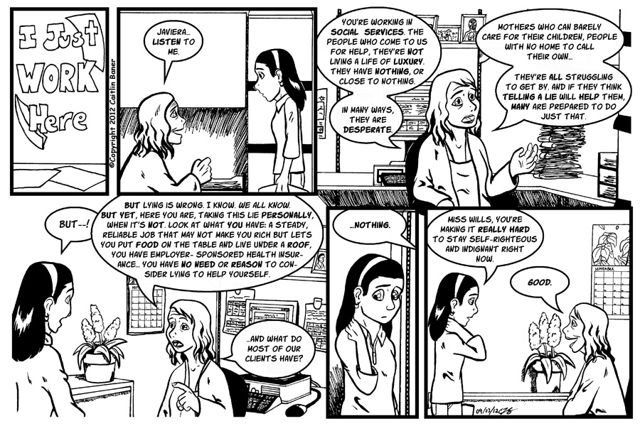 Having said that, I also ought to point out Javiera's reaction to this client is almost exactly what my own reaction was the first time this happened. I couldn't believe someone would actually lie to me! I took it VERY personally until a worker explained to me more or less what Miss Wills is telling Javiera. It really helped put things in perspective, but I'd be lying if I said I wasn't still disappointed afterwards, or if I said it doesn't disappoint me when it happens to this day.