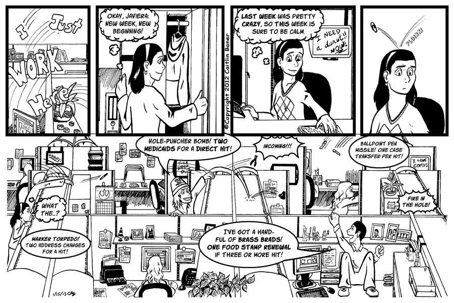 On a side note: The Gallery has been updated to include Office Raccoons! IJWH is not my first office-related artistic endeavor; back in 2010 my dad asked if I would draw him some raccoons in the office, and I obliged. One of the drawings was actually colored and has been in the Gallery since the section went up, but I've now added a special section including all 8 Office Raccoon pages. Enjoy!