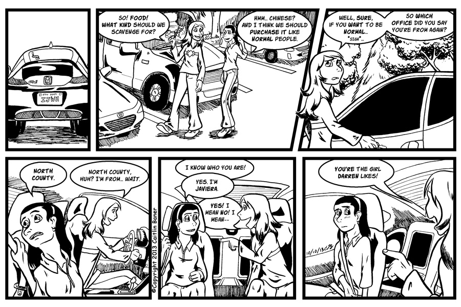 Yeessss, Allison drives a Honda CR-Z. This is because the CR-Z is an oober cool car. However, it *might* have been in my best interests to oh, say, practice drawing cars before drawing this comic... Unfortunately I've been overwhelmed with personal projects and web designing and didn't have any time to practice, so I had to wing it. I promise to do better next time.