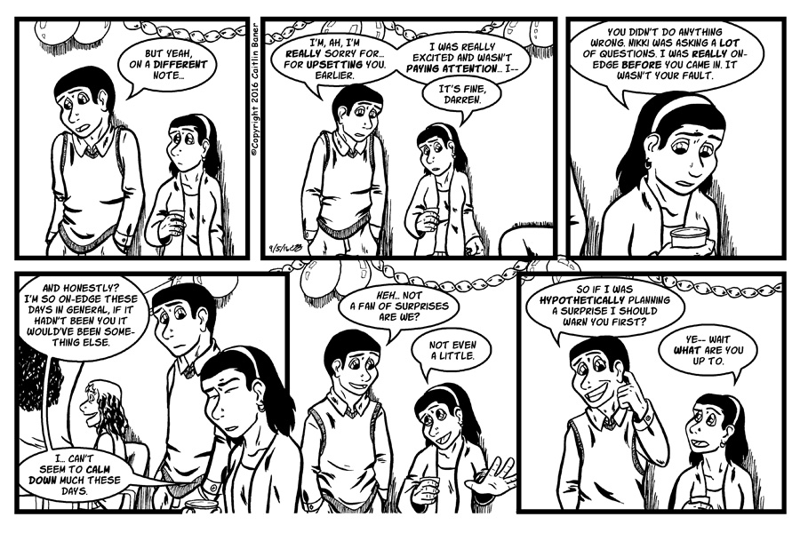 It was nice to take a break from big crowd scenes for this page. I'm not good at drawing tons of people in each panel, it was nice to dial it back just a bit. Also, makes the page faster to draw!