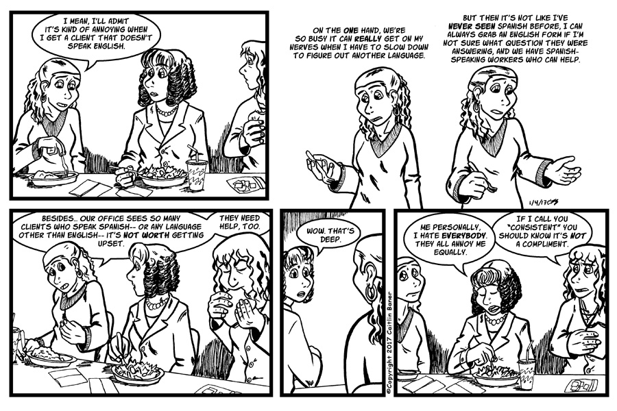 I actually really struggled with drawing this comic... I have a muscle cramp deep in the palm of my right hand, and while it doesn't hurt what it does is it keeps creating these weird little spasms with my thumb. When you're drawing things you want a calm, steady hand to gently guide the brush across the paper. Instead I had to deal with this obnoxious spasm... and consequently spent way more time in Photoshop than I have in a long time fixing this up. >_< But it's done and it's up on time, so there is that. Victory. Woo.