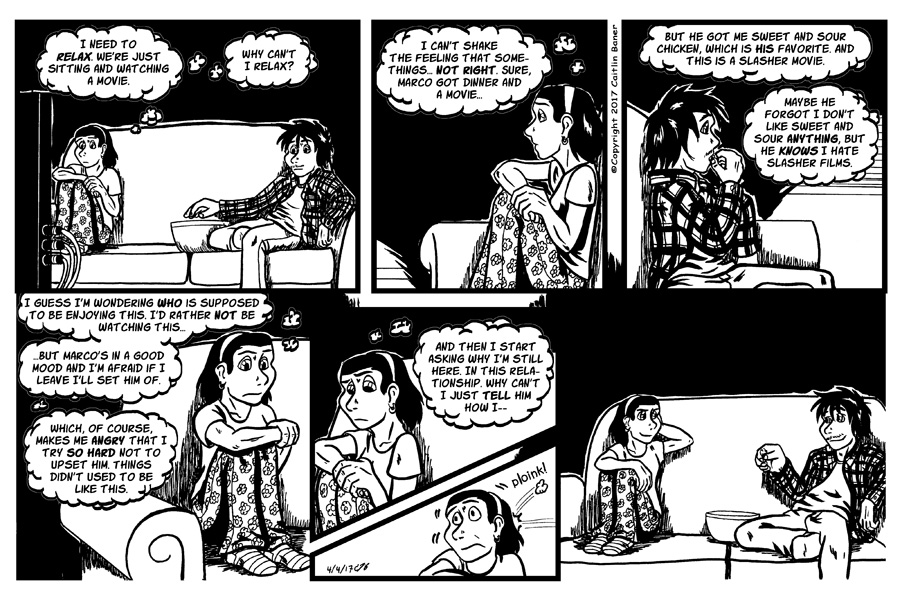 I really struggled with the background on this one. They're watching a movie at night, so it's going to be dark, but I wasn't sure how to go about inking it. On the one hand an all-black background is simple to do, on the other I wasn't sure that was what was required. I actually inked the entire background for the first three panels before realizing I was going about it wrong. After spending a few hours trying to figure out how to shade the background but still make it look coherent I realized I needed to just take a huge brush and make it all look coherent. There is a new vote on TopWebComics if you want to see what this page looked like before Photoshop!