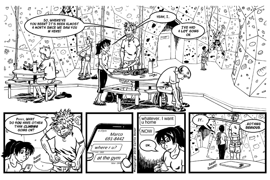 This page took forever to finish. Or rather, that top panel did. I wanted to design Javiera's climbing gym to look realistic, and tried to design it based on something you would actually see in a real climbing gym, taking bits and pieces of gyms I've been to and trying to incorporate it into something new but believable.